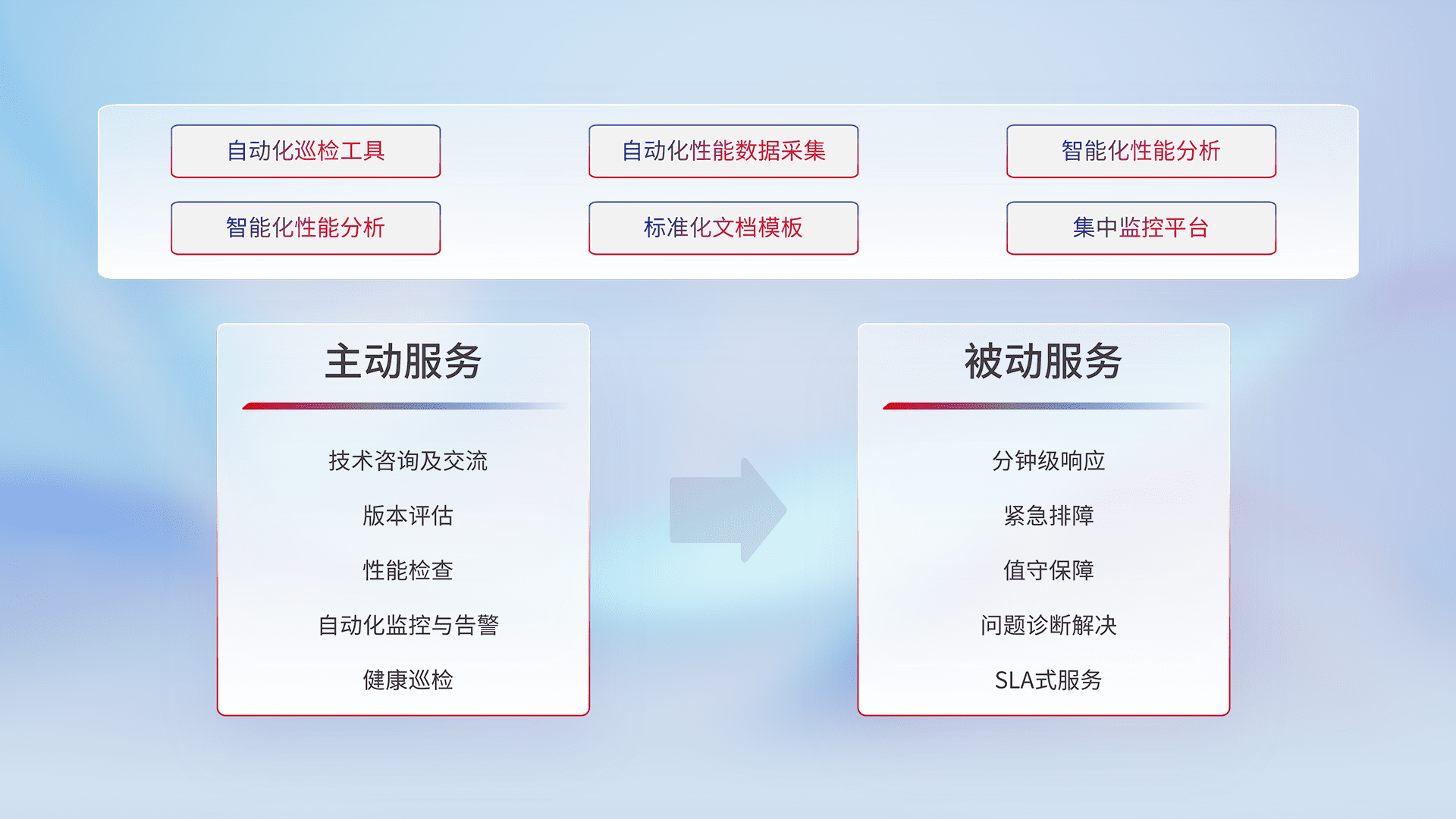 智能化工具和标准化文档,,,保障服务质量,,提供主动服务(包含技术咨询、、、、版本评估、、、、性能检查、、、、自动化监控与告警、、健康巡检)和被动服务包含(分钟级响应、、、紧急排障、、、、值守保障、、问题诊断解决、、、、SLA服务)。。